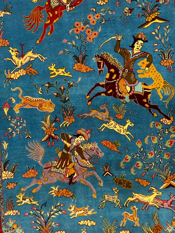 قالیچه دستباف 2.8متری چله و گل ابریشم طرح شکارگاه یکی از نقوش با اصالت و قدیمی ایران باستان