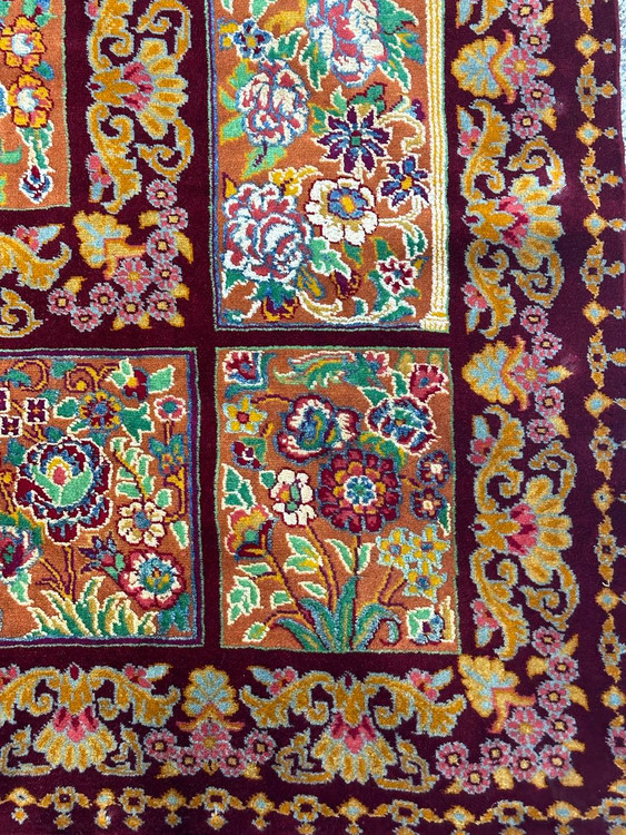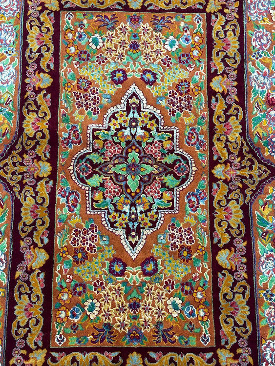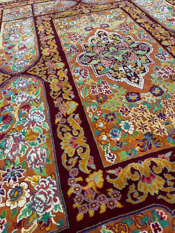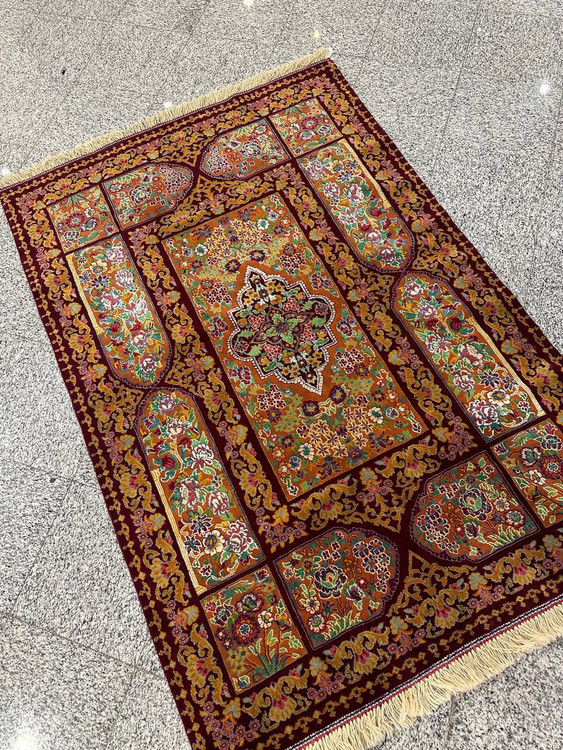 فرش دستبافت گل ابریشم قشقایی با متریال و رنگ طبیعی با رج 40 ریزبافت