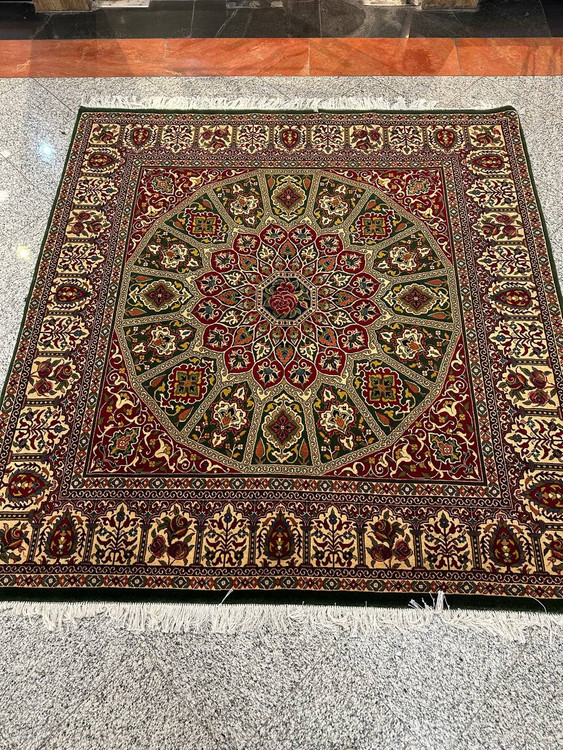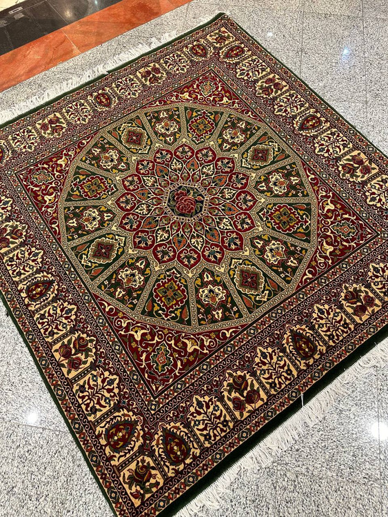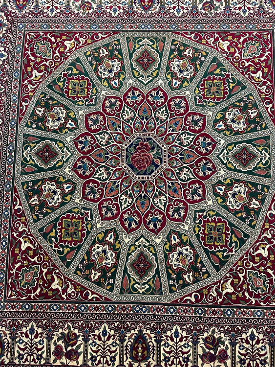 فرش مربع 4متری گل ابریشم نقش گنبدی بر گرفته از معماری های گنبد مساجد اصفهان تلفیق با نقش گل فرنگ با گره با دوام و طول عمر بالا،ریزبافت با رنگ گیاهی
