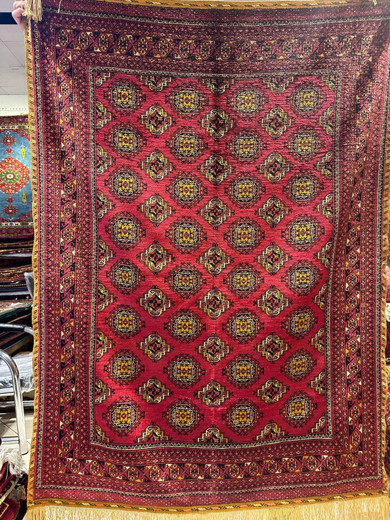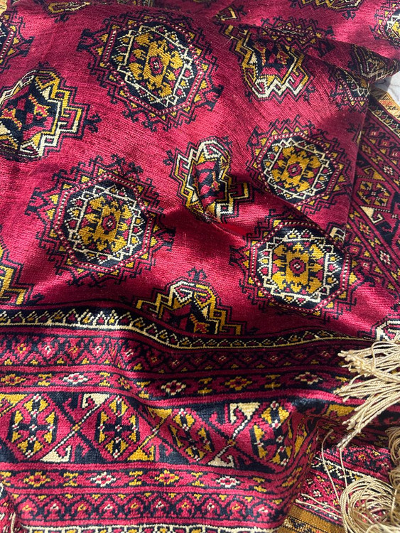 فرش دستبافت تمام ابریشم 1.5متری دورو بافت نقش گل سارق ترکمن 80رج بافت خراسان رنگ گیاهی کد1200008