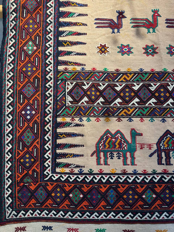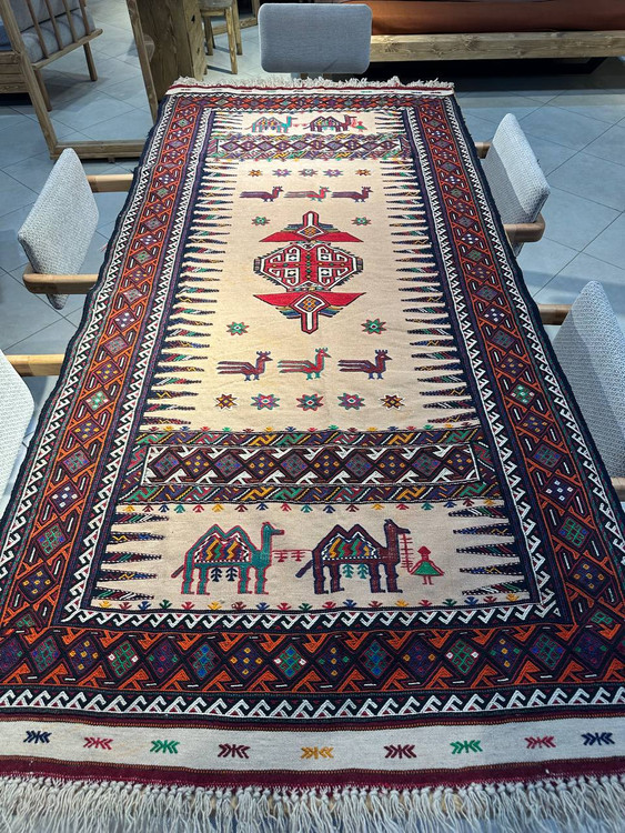 شترها: وجود شترها در این گلیم، نشان دهنده اهمیت این حیوان در زندگی عشایری و کوچنشینی مردم این منطقه است. شترها، نماد استقامت، قدرت و سفر هستند.