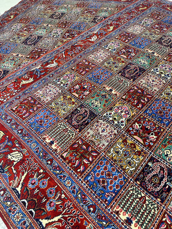 فرش دستبافت 6متری پشم و ابریشم نقش خشتی بافت بیرجند 40 رج در حد نو 0500345