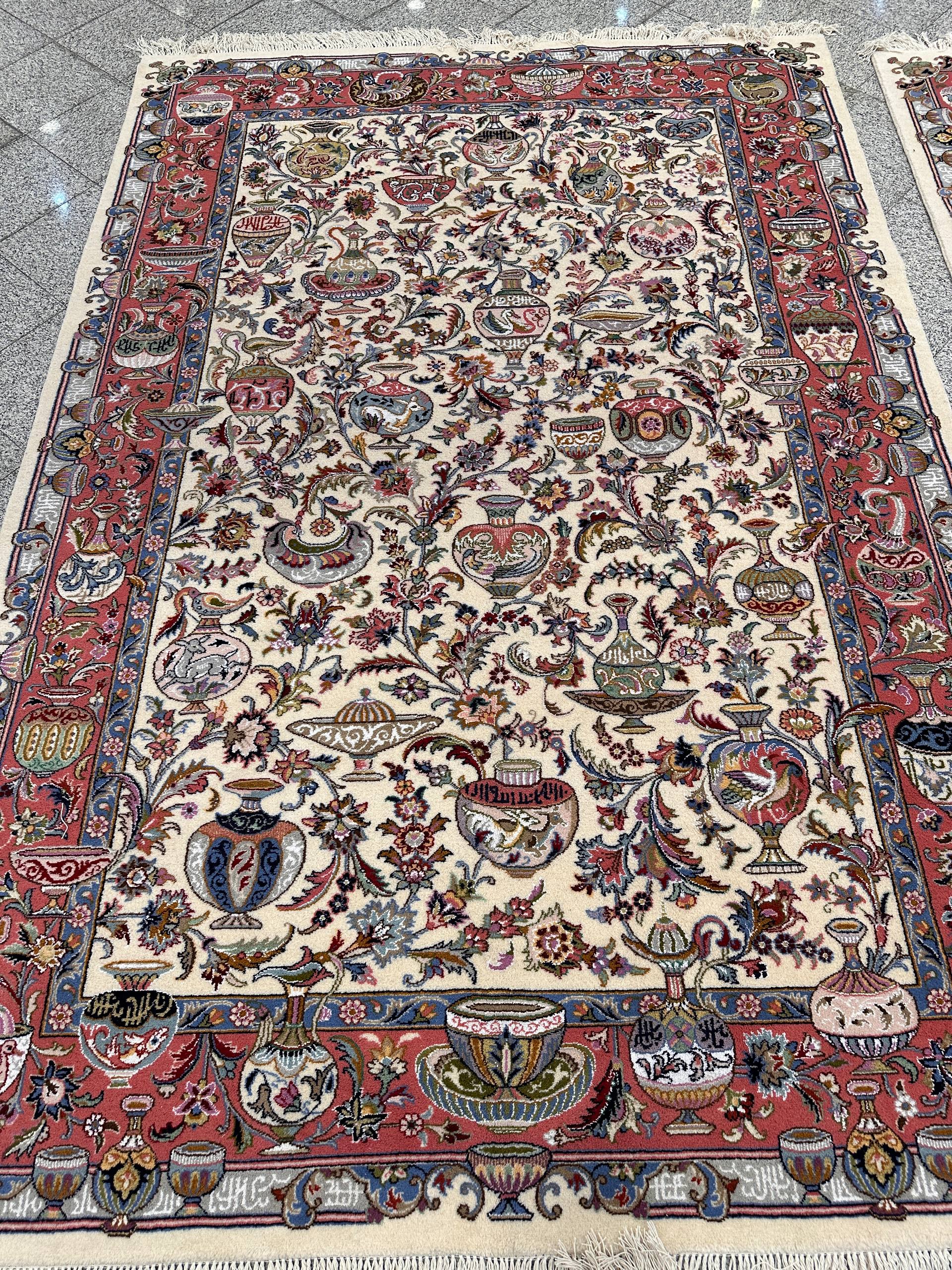 فرش دستبافت 9متری تما پشم و گل ابریشم نقش کاسه و کوزه بافت کاشمر کد A001